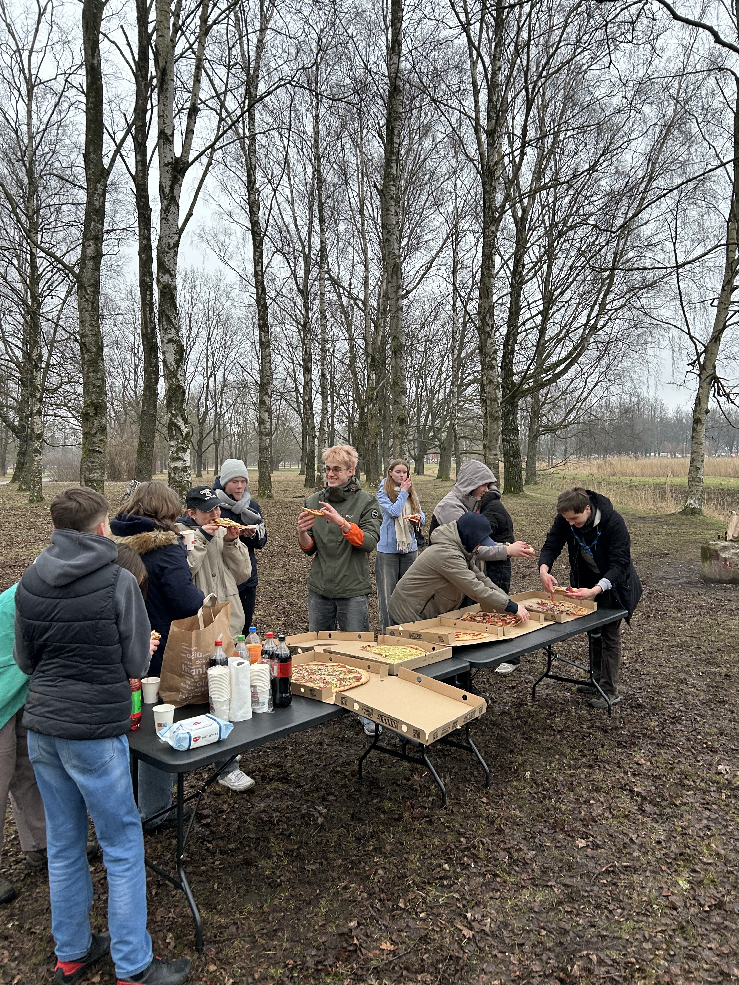 Reizi sezonā notiek nodarbība ar picu ēšanu.